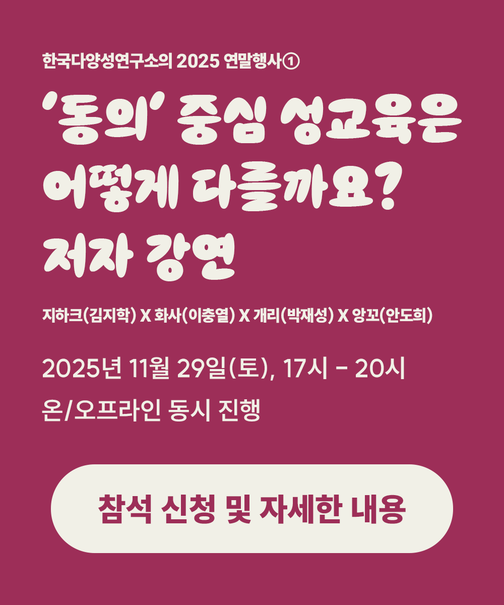 한국다양성연구소는 어린이, 청소년, 여성, 성소수자, 장애인 등 모든 사람이 자신의 신체, 젠더, 섹슈얼리티 그리고 모든 삶에 대해서 스스로 생각하고 고민하고 탐험하며 결정해 갈 수 있는 주체적인 사람이 되어 서로 연대하며 평등한 사회를 만들어 가는 사람이 될 수 있도록 돕는 성교육과 성평등교육을 제공합니다.